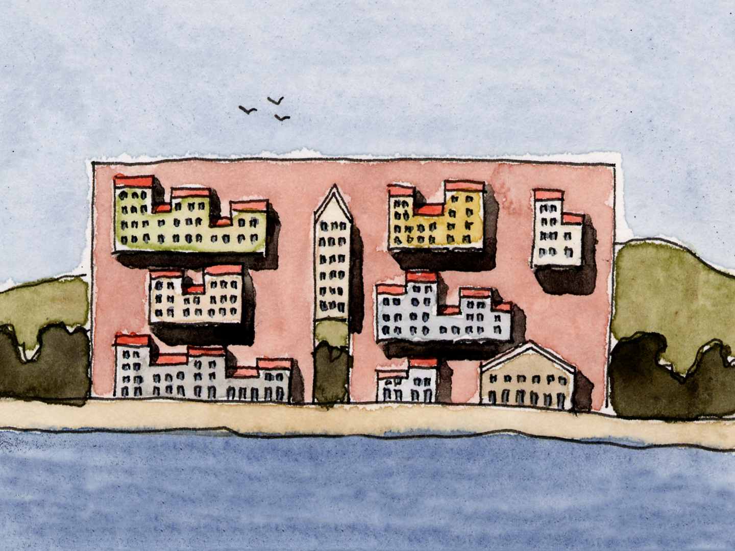 1. Il Grande muro, sulla spiaggia, compone verticalmente frammenti di tessuto e due singolarità, di cui la verticale, prende enfasi nel marcare, con esattezza, il varco, come fosse una grande porta urbana sul paesaggio. Sembra che l’architettura abbia scelto di commisurarsi alla natura dislocandosi su una parete verticale che la può: esporre.